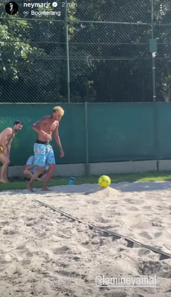O camisa 10 do Santos, Neymar, recebeu o atacante Lamine Yamal em sua casa, em Mangaratiba, no Rio de Janeiro, na última quinta-feira (19). O craque publicou um vídeo do jovem atleta jogando futevôlei na capital carioca.