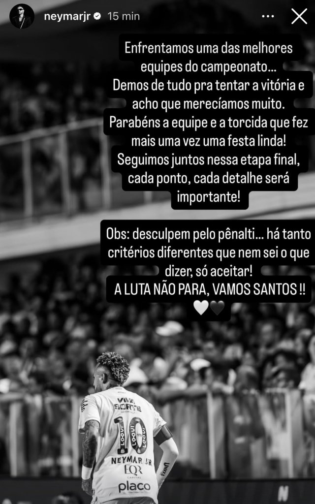 O atacante começou sua publicação reconhecendo a força do adversário. O Mirassol vive grande fase no Brasileirão, integra o G-4 com 60 pontos e, segundo Neymar, exigiu o máximo da equipe santista.