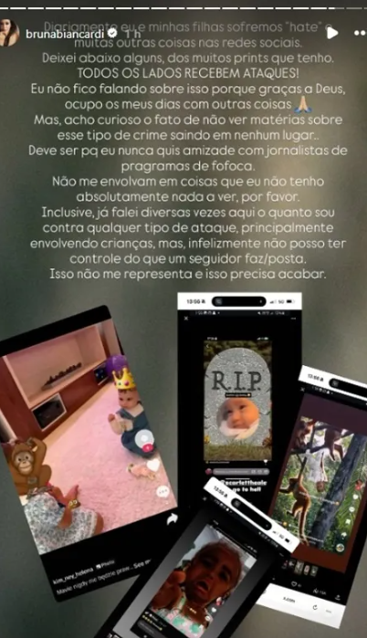 Bruna relatou receber mensagens de ódio direcionada as crianças diariamente, com fotos desejando a morte das herdeiras, além de comentários maldosos sobre a aparência das filhas.