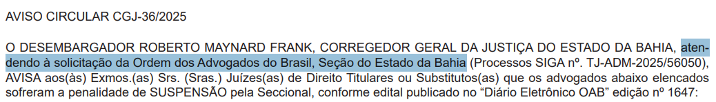 A Ordem dos Advogados do Brasil, seção Bahia, solicitou ao Setor de Tecnologia da Informação do Tribunal de Justiça da Bahia (TJ-BA) a correção das publicações repetidas e contínuas que vêm sendo divulgadas no Caderno TJ-BA do Diário de Justiça Eletrônico Nacional (DJEN).