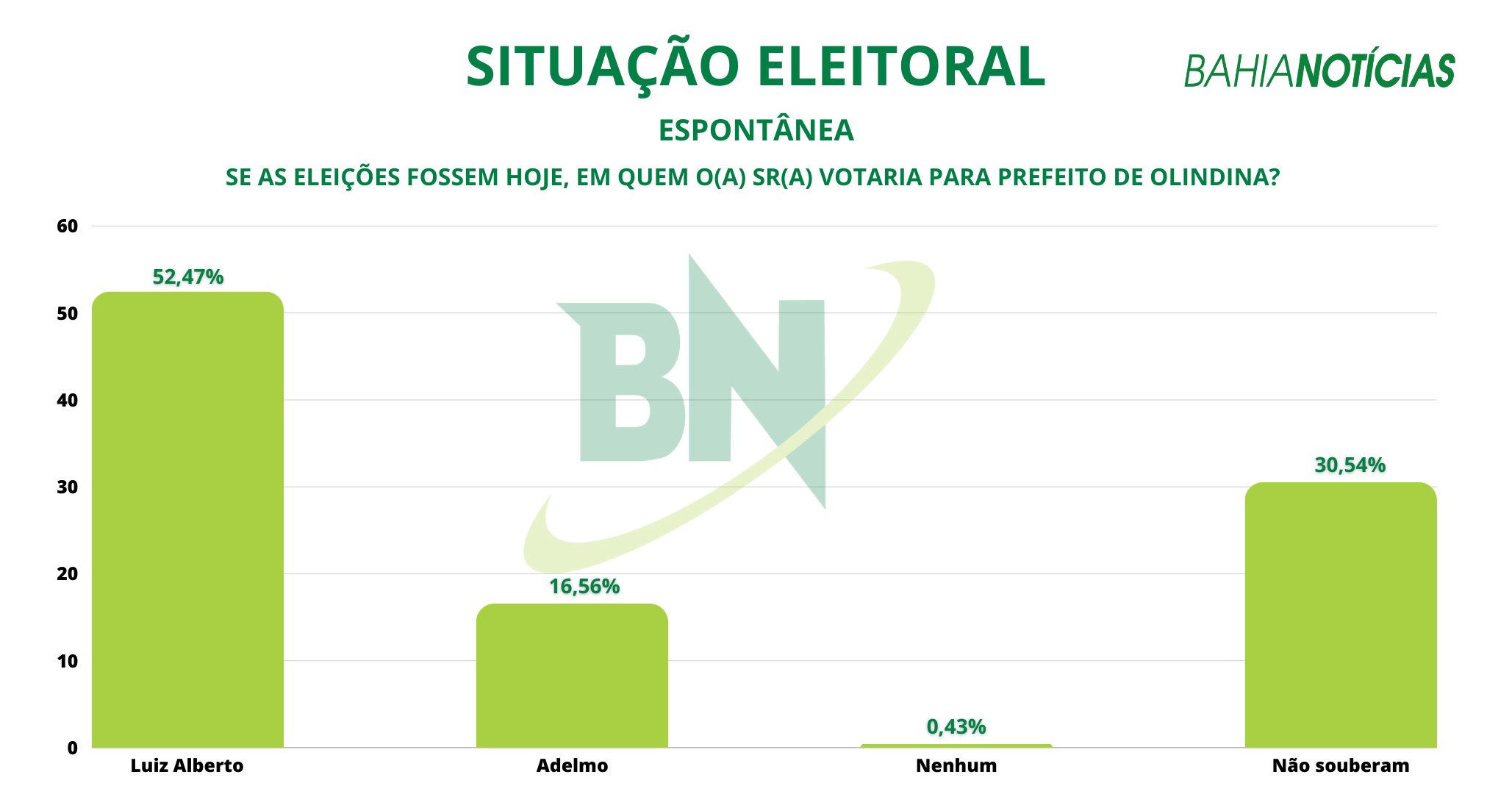 O atual prefeito e candidato à reeleição em Olindina, Luiz Alberto (PSD), atingiu 64,30% das intenções de voto e desponta como a favorito na corrida eleitoral no município. É o que indica o levantamento contratado pelo Bahia Notícias junto à empresa Séculus Análise e Pesquisa.