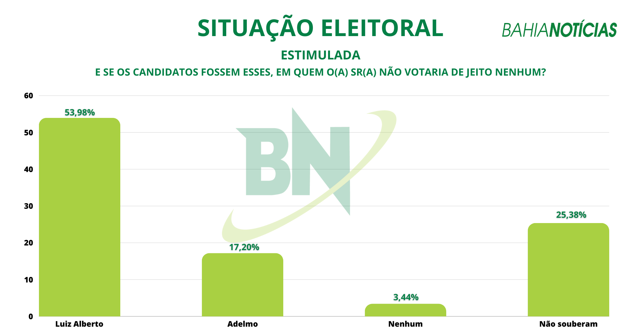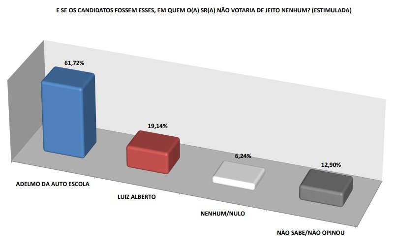 No que diz respeito à rejeição, quando perguntados sobre em quem eles não votariam de jeito nenhum, 61,72% dos entrevistados responderam o candidato do Avante e 19,14% citaram Luiz Alberto. 6,24% responderam nenhum ou nulo e 12,90% dos eleitores não respondeu.