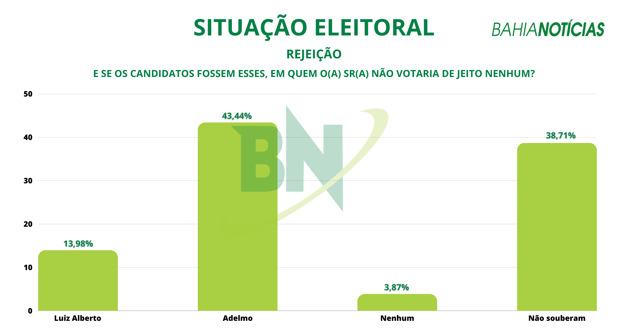 Com relação aos índices de rejeição, quando perguntados sobre “quem eles não votariam de jeito nenhum”, o candidato da oposição aparece com 43,44% das respostas. Luiz Alberto aparece com 13,98% e 3,87% responderam “nenhum”. Outros 38,71% não souberam responder ou não opinaram.