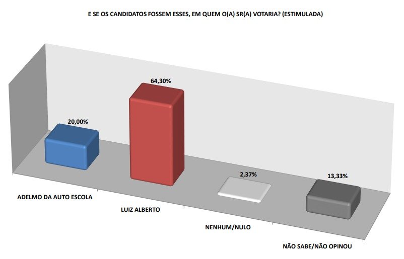 Quando perguntados sobre o candidato que deve ganhar a eleição, independente das intenções de voto, Luiz Alberto lidera com 58,28% das previsões. Adelmo aparece com 17,63% e outros 24,09% dos entrevistados não souberam responder.