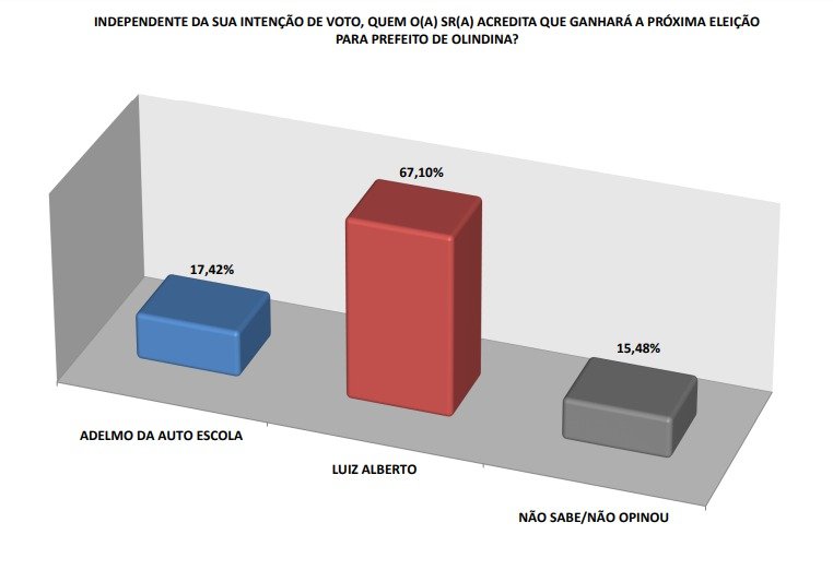 Quando perguntados sobre o candidato que deve ganhar a eleição, independente das intenções de voto, 67,10% dos munícipes responderam Luiz Alberto, contra 17,42% que citaram Adelmo da Auto Escola. 15,48%não souberam ou não opinaram.