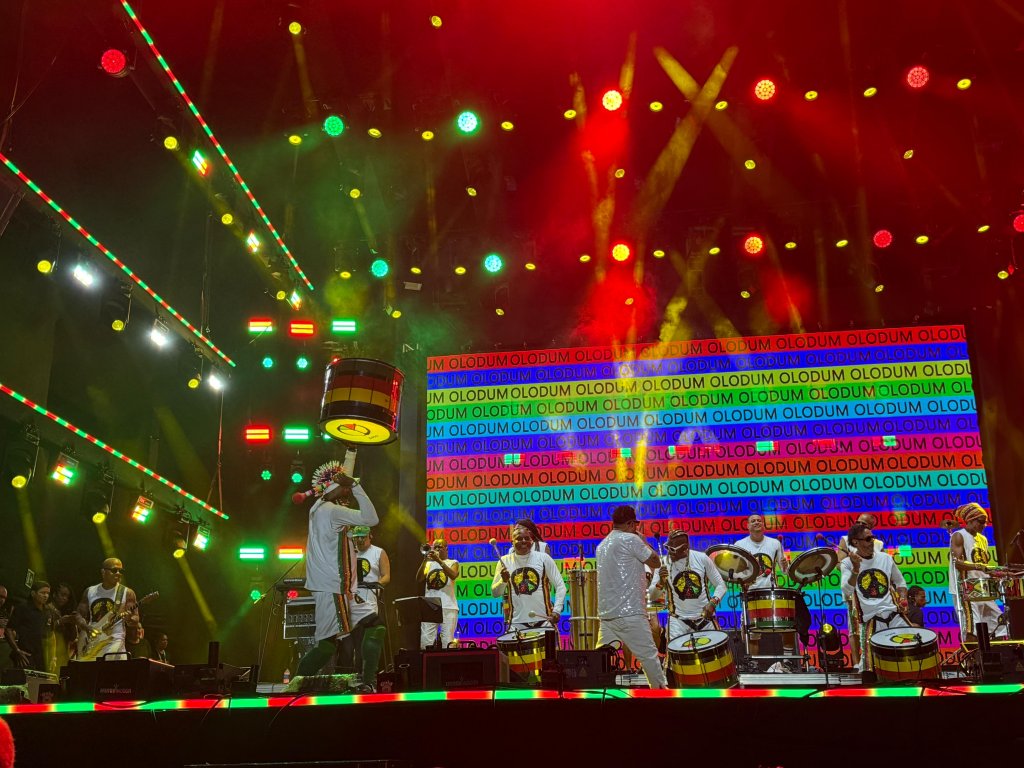 Ao som de “Alegria Geral”, a banda deu início ao show embalada por um compilado de imagens que revisitam momentos marcantes de sua trajetória. O samba-reggae, marca registrada do Olodum, conduziu a entrada do grupo e deu o tom da apresentação desde os primeiros minutos.