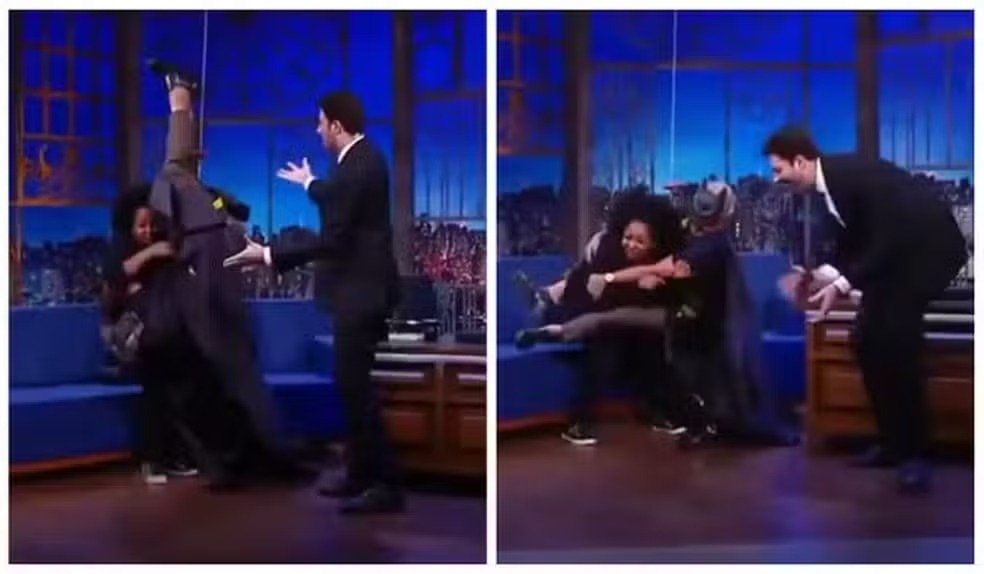 A humorista relatou também que o apresentador a prendeu com as pernas, simulou relações sexuais e repetiu os gestos ao empurrá-la em um sofá.