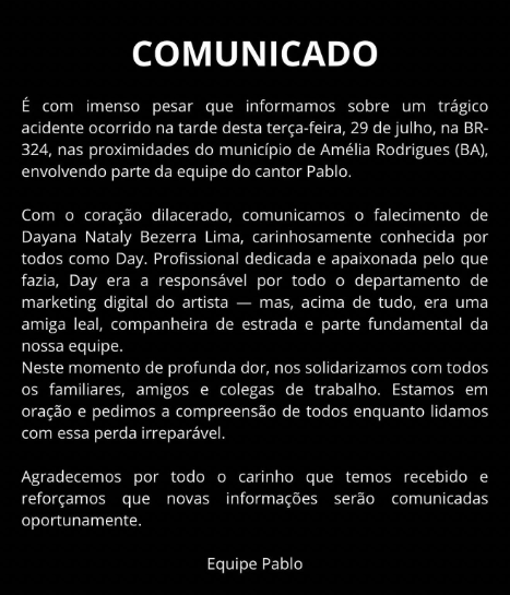 O cantor Pablo se pronunciou por meio de um comunicado após o acidente na BR-324 que matou a diretora de marketing da equipe do artista, Dayana Lima, na última terça-feira (29).