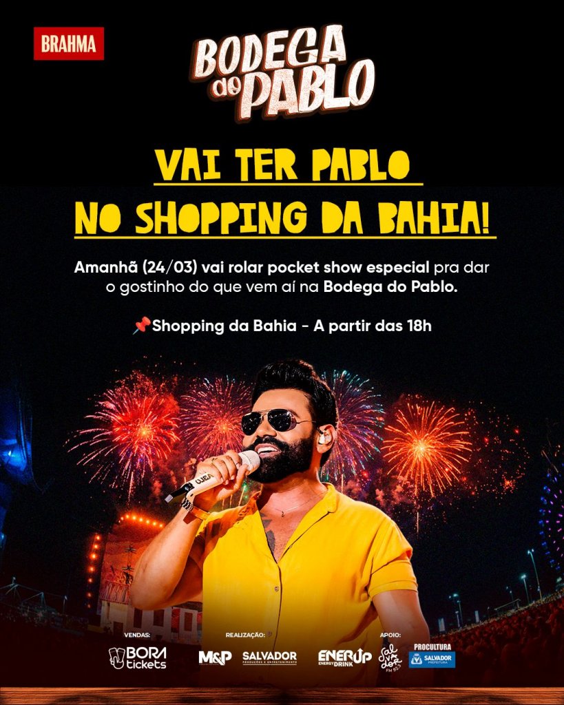 O cantor Pablo fará um pocket show especial no Shopping da Bahia como aquecimento do público para a "Bodega do Pablo", em abril. O pocket show ocorrerá na próxima terça-feira (24), a partir das 18h.