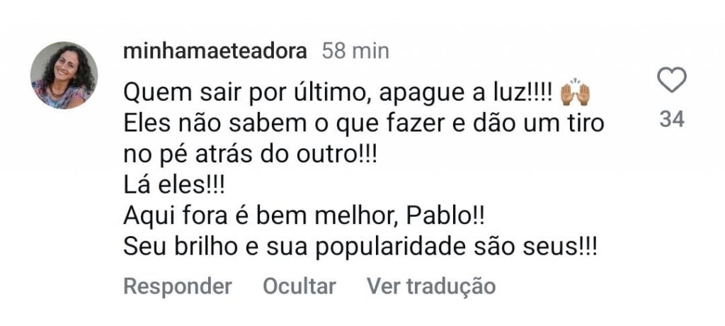 “Quem sair por último, apague a luz! Eles não sabem o que fazer e dão um tiro no pé atrás do outro! Lá eles! Aqui fora é bem melhor, Pablo! Seu brilho e sua popularidade são seus”, comentou a atriz.