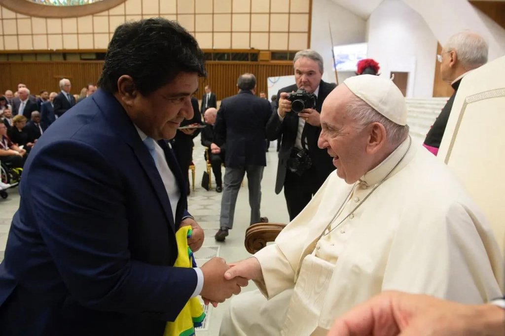 “Ele [papa Francisco] nos atendeu numa audiência privada. No dia, muitos correram, ficaram sentados na frente com o propósito de serem cumprimentados por ele. E para nossa surpresa no encerramento ele falou que iria abençoar e falar com cada um individualmente. Foi uma explosão de alegria, formamos uma fila e ele apertou a nossa mão. Eu sorri e fiquei muito emocionado. Ele me disse palavras animadoras e palavras carinhosas, palavras incentivadoras e de muita afeição pelo Brasil”, apontou.