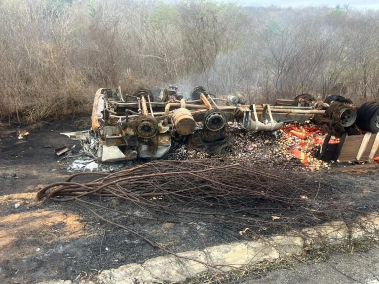 Um caminhão carregado de cebolas tombou e pegou fogo na manhã desta quarta-feira (19) em um trecho da BA-026 de Planaltino, no Vale do Jiquiriçá. O acidente ocorreu por volta das 7h30, no km 200 da rodovia.