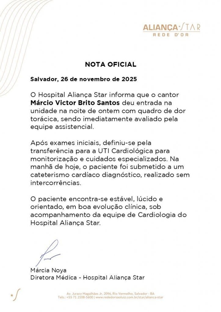 O boletim médico de Márcio, assinado por Márcia Noya, diretora médica da unidade, indicou uma evolução clínica favorável, o que resultou na autorização da equipe médica para o pagodeiro ir para casa.