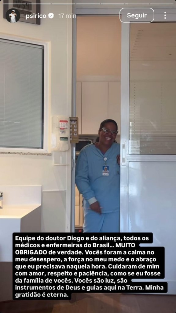 “Equipe do doutor Diogo e do Aliança, todos os médicos e enfermeiras do Brasil.. MUITO OBRIGADO de verdade. Vocês foram a calma no meu desespero, a força no meu medo e o abraço que eu precisava naquela hora. Cuidaram de mim com amor, respeito e paciência, como se eu fosse da família de vocês”, prosseguiu o cantor.