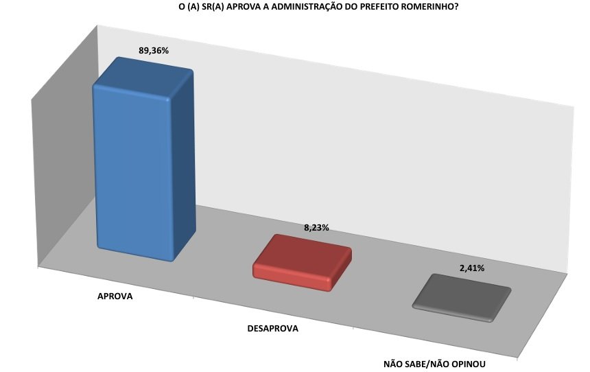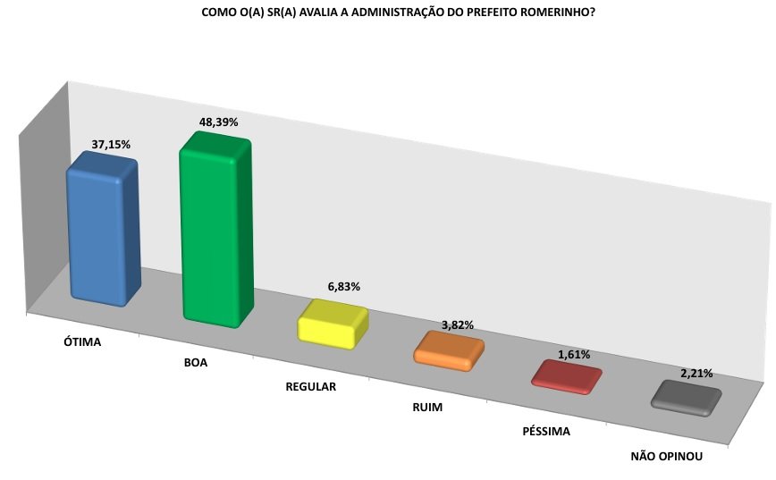 Em relação à avaliação do governo Romerinho, 70% dos entrevistados acham boa e 15,5% a consideram ótima. Já 10,41% apontam como péssima, 0,73% acreditam ser regular e 0,48 ruim. Não sabem ou não opinaram chegam a 2,18%.