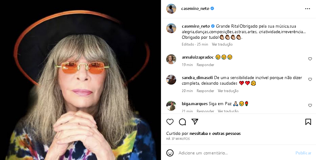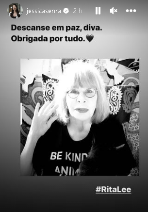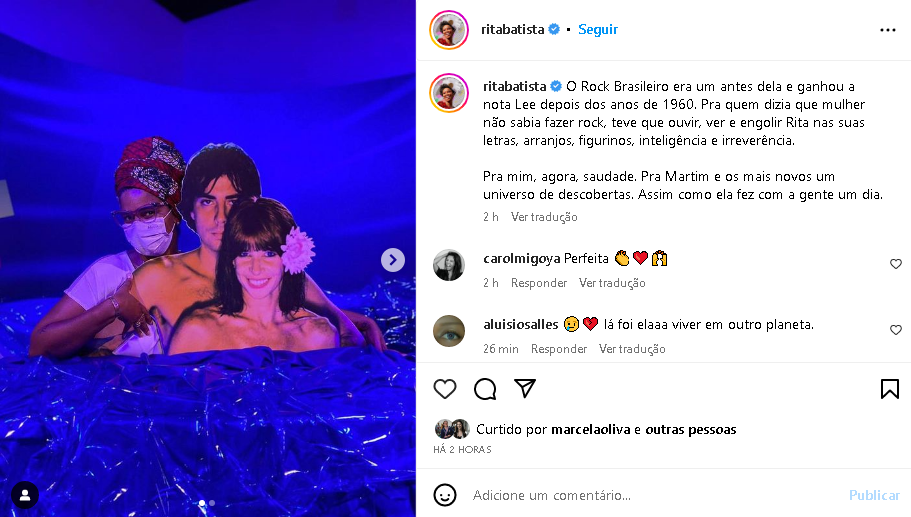 Na legenda da publicação, ela revela toda sua admiração por Rita. “Existem pessoas que merecem uma despedida daquelas porque apesar de ser uma saudade que ainda nem chegou, a gente já sente o sabor. Rita é maior que a vida. Sua arte é um ritual. Uma oração pra quem escolhe viver em toda a sua essência, como mutante sendo tudo o que pode ser. Não é por acaso que eu me vejo tanto nela: Artista, paulista, capricorniana e devota da rebeldia. Por tanta inspiração e tanta verdade; Nossa eterna gratidão a Rita Lee Jones”.