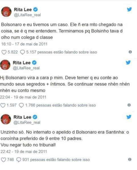 Em meio à disputa eleitoral deste ano, internautas recuperaram alguns tweets de 2011 feitos pela cantora Rita Lee. Nas mensagens, ela zomba do candidato à Presidência da República, Jair Bolsonaro (PSL).