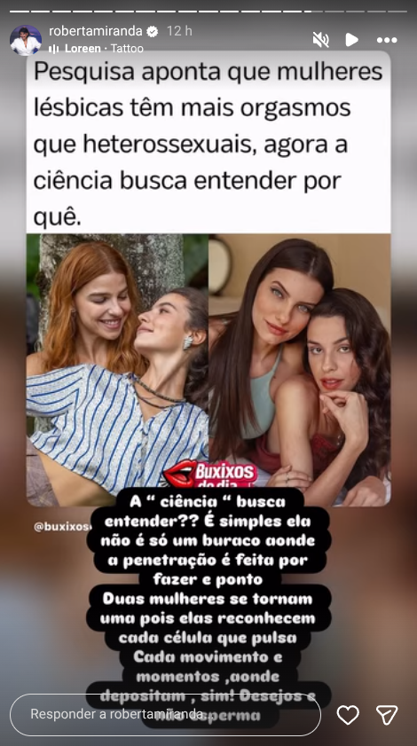 A publicação compartilhada pela cantora foi feita por um perfil no Instagram chamada “Buxixos do Dia” e afirmava que “pesquisa aponta que mulheres lésbicas têm mais orgamos que heterossexuais, agora a ciência busca entender por quê”.