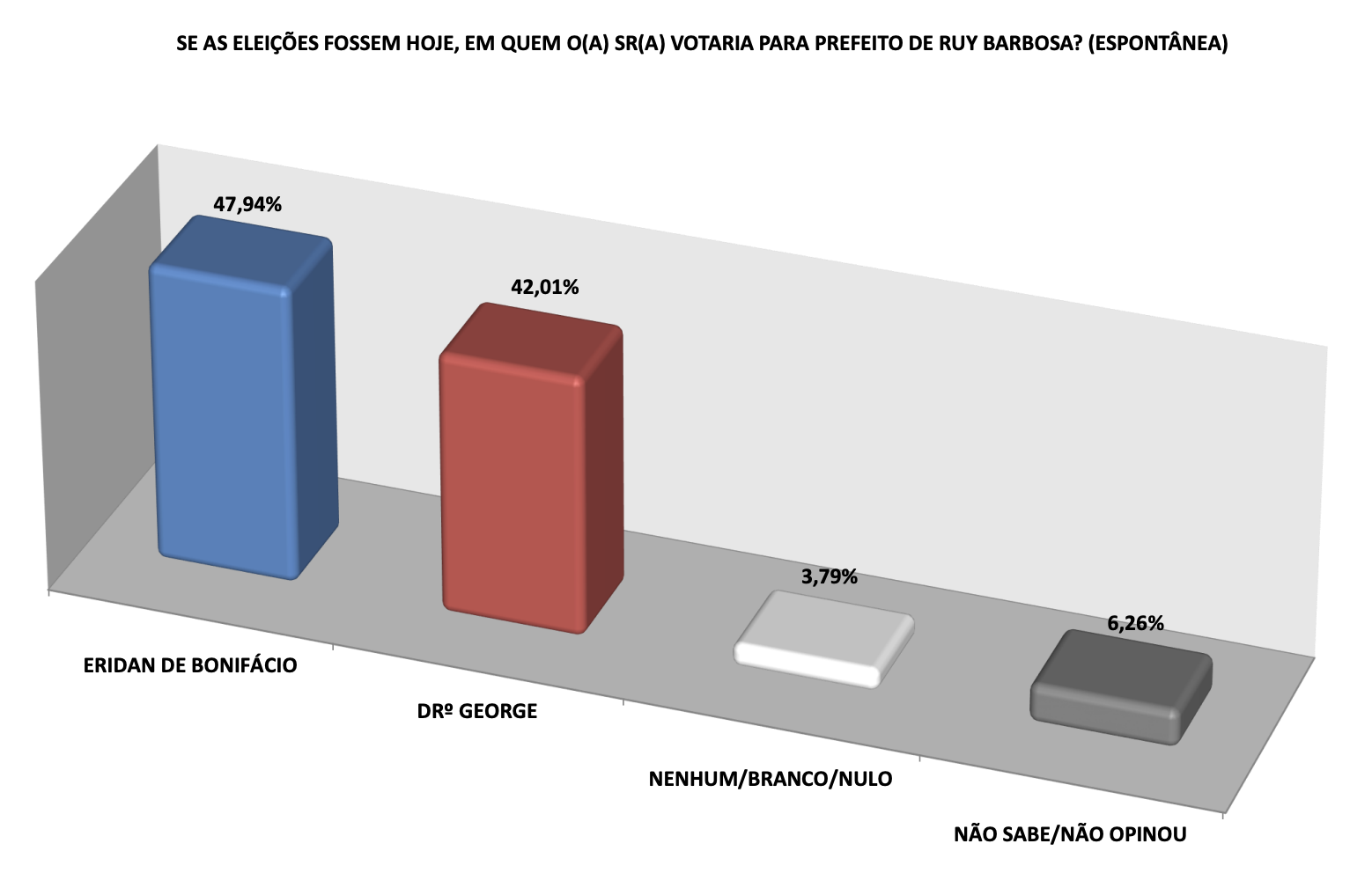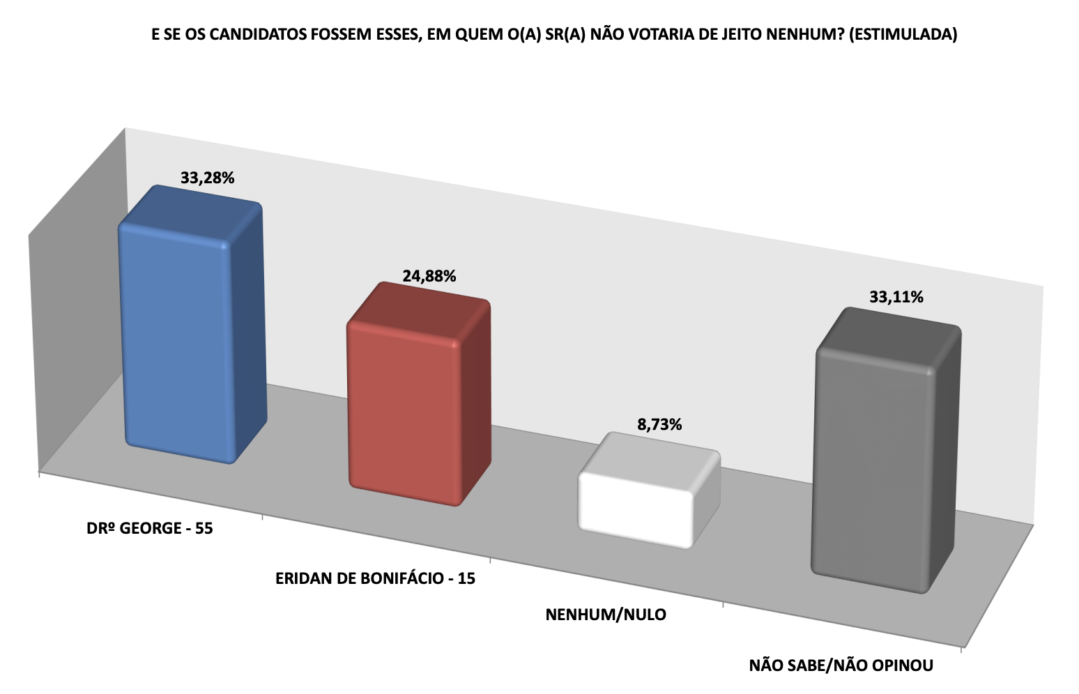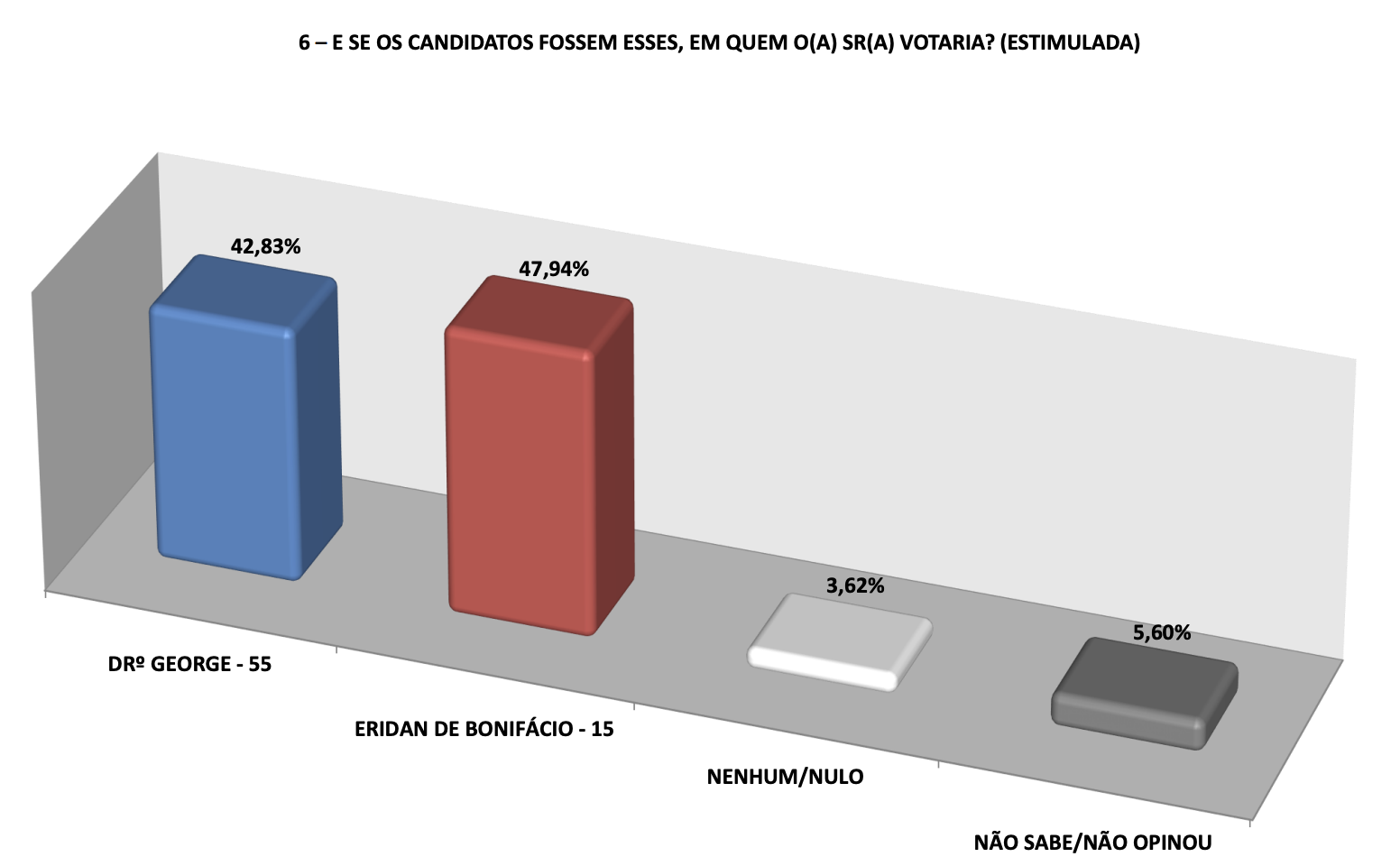 A pesquisa ainda testou o cenário estimulado, quando o nome dos candidatos é apresentado aos eleitores. Eridan de Bonifácio também lidera nesse caso com 47,94%, contra 42,83% de Dr. George. Nenhum ou nulo chegam a 3,62% e não sabe ou não opinou representa 5,60% dos entrevistados.