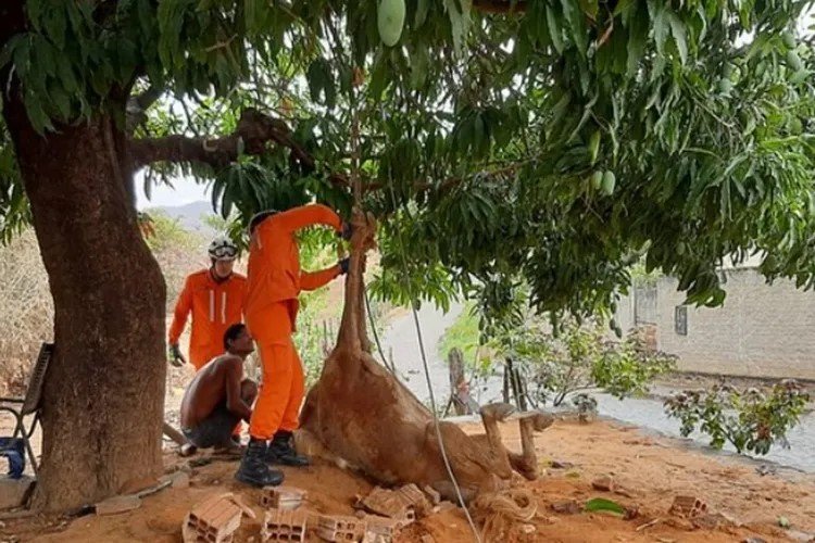 Agentes do 20° Batalhão de Bombeiro Militar (BBM) foram acionados e ao chegar no local montaram um sistema de polias com ancoragem para retirar o animal de forma segura.