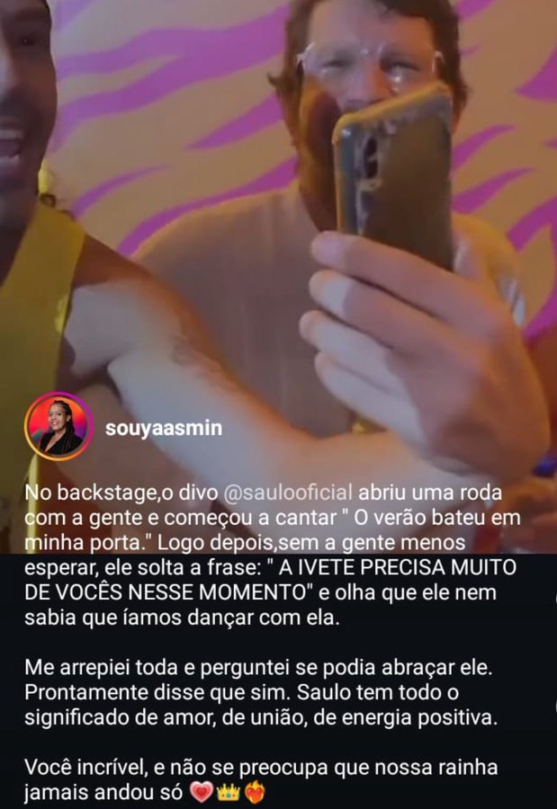 Um relato compartilhado nas redes sociais por uma fã que participou da ação onde Ivete levou admiradores para o palco, trouxe para o público a informação de que Saulo teria dito para o grupo "A Ivete precisa muito de vocês nesse momento".