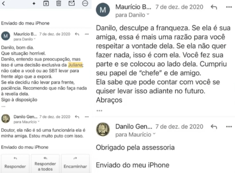 "Tem muita incoerência no que ela diz, pelo menos ao meu respeito. Quando a Juliana me disse que sofreu abuso, eu falei: 'estamos na trincheira, vem comigo e vamos denunciar ele na polícia'. Ela disse: 'não quero que denuncie ele na polícia'. Falei: 'então vamos denunciar no compliance do SBT'. Ela falou: 'não quero que denuncie ele no RH'", disse ele que só teve conhecimento sobre o assunto em 2020, após a denúncia de Dani Calabresa contra Marcius Melhem.