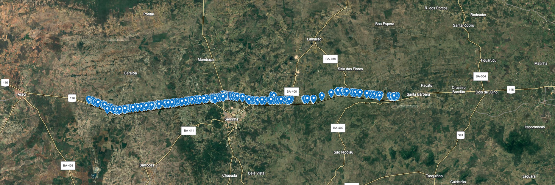Para as desapropriações, a localização do polígono se estende do km 334,23 ao km 387,41, totalizando uma extensão de 53,18 quilômetros. Desse total, 7 km correspondem à variante do contorno do município de Serrinha.