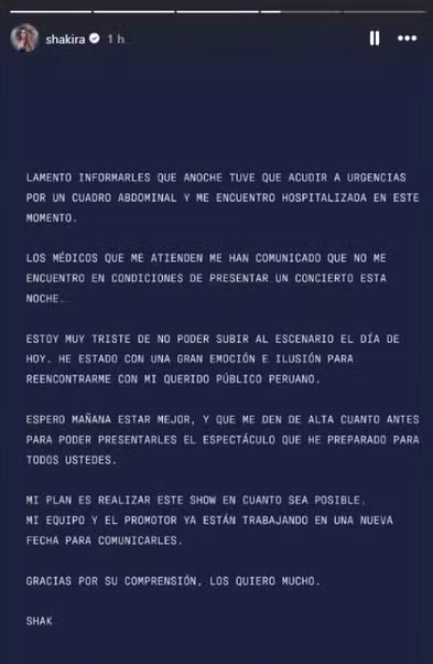 A cantora Shakira, de 48 anos, adiou um show que faria no domingo (16), no Estádio Nacional do Peru, em Lima, após ser hospitalizada com quadro abdominal.