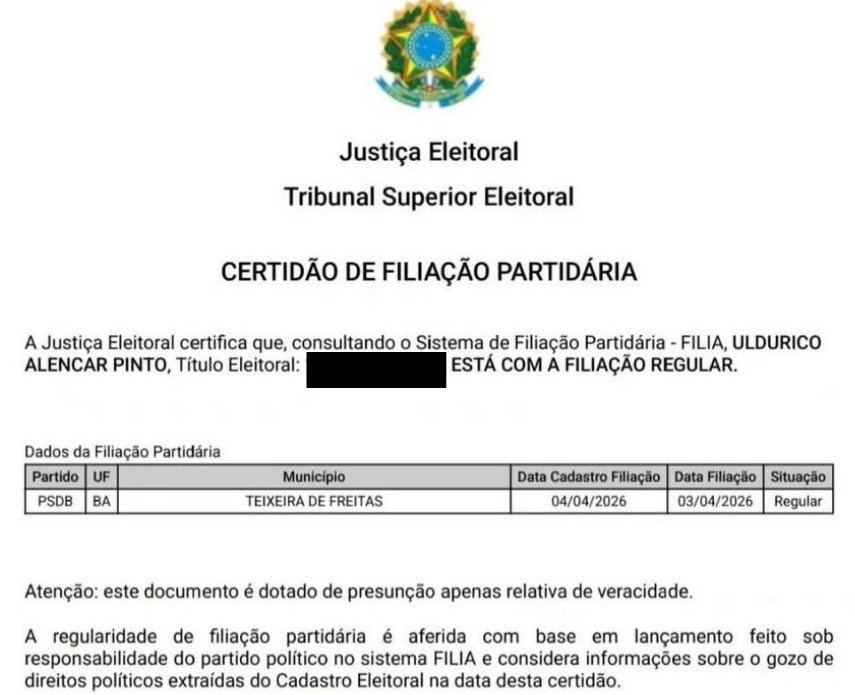 A filiação de Uldurico foi confirmada pelo Bahia Notícias em consulta ao sistema do Tribunal Superior Eleitoral (TSE). No documento, é possível identificar que ele se filiou ao PSDB no dia 3 de abril deste ano, data do fechamento da janela partidária. Confira: