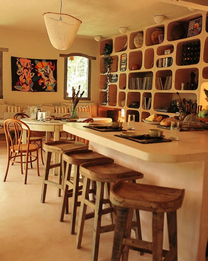 Com formas orgânicas e linhas arredondadas, a casa reúne elementos como nichos curvos e mobiliário de concreto. Parte das referências remete a projetos do arquiteto Oscar Niemeyer. Objetos e esquadrias foram garimpados no interior da Bahia e integram o conjunto.