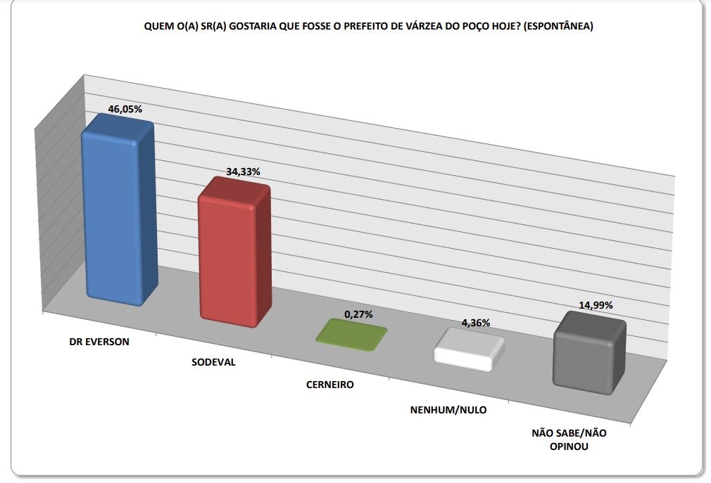 Drº Everson (União Brasil) atingiu 46,59% das intenções de voto e lidera a corrida eleitoral no município de Várzea do Poço, na Bacia do Jacuípe. É o que indica o levantamento contratado pelo Bahia Notícias junto à empresa Séculus Análise e Pesquisa.