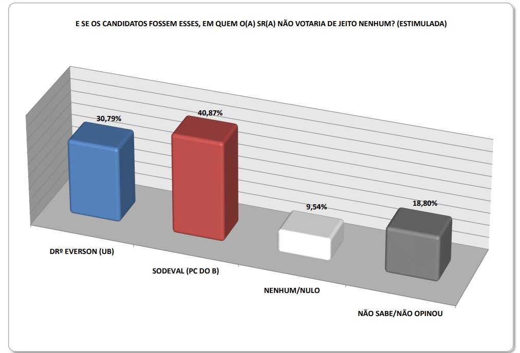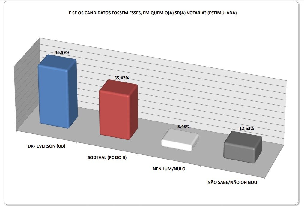 Em cenário estimulado, quando são apresentados os nomes dos candidatos, Drº Everson atinge 46,59% das intenções de voto, enquanto Sodeval conseguiu 35,42%. 12,53% não se decidiram ou não quiseram responder o questionário e 5,45% afirmaram que iria voltar nulo.