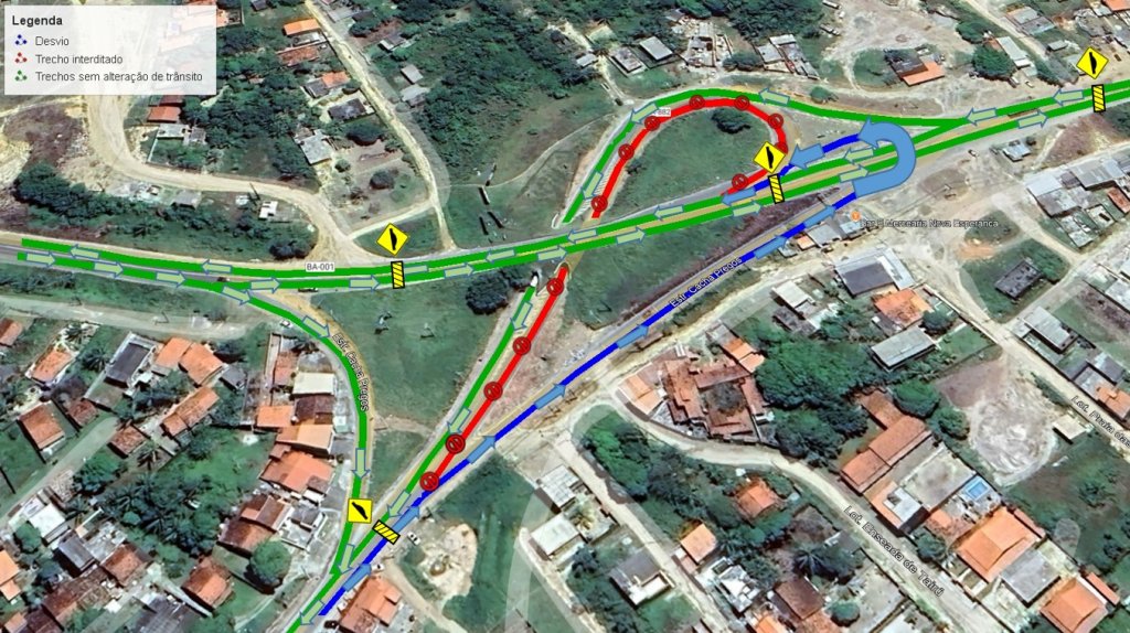 Para garantir a fluidez do trânsito durante o período de interdição, uma rota alternativa foi criada. Um desvio foi construído ao lado do túnel, e o trecho já está devidamente sinalizado. Além disso, foram implantados quatro redutores de velocidade (quebra-molas) e um retorno na BA-001 para melhorar o fluxo de veículos.