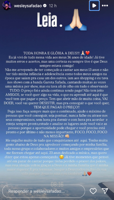Um longo desabafo feito pelo cantor Wesley Safadão ligou um alerta no público sobre a saúde mental do artista, que logo foi esclarecida por um texto de gratidão.