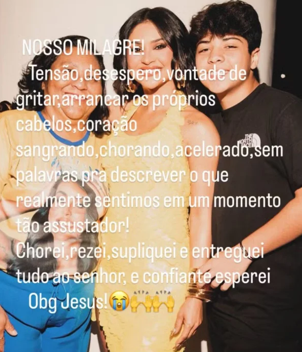 Em texto, a avó do garoto afirmou que o neto era um milagre. Yhudy Lima, fruto do casamento de Safadão com Mileide, foi submetido a uma cirurgia de emergência na última sexta (19), após o diagnóstico de um tumor no cérebro, que, de acordo com os médicos, deve ser benigno.