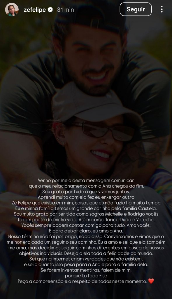 No texto publicado por Zé Felipe, ele destacou que a razão do término não foi uma briga entre o casal e destacou a relação entre sua família e a da boiadeira.