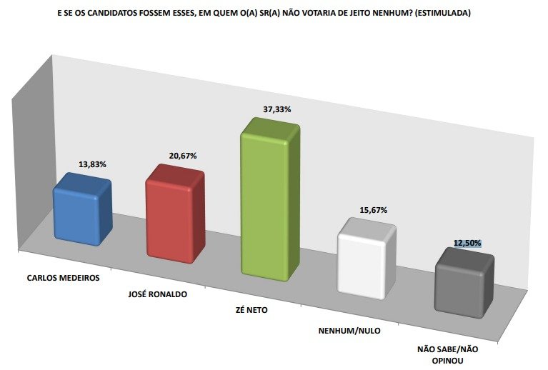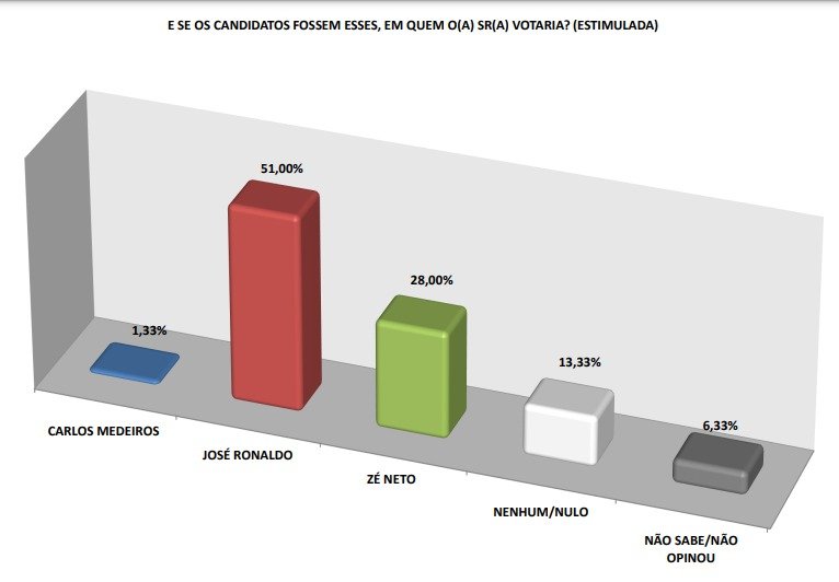 O instituto ainda indicou que em um cenário de 2º turno, Zé Neto teria 46,8% contra 46,1% de José Ronaldo, uma diferença decimal e que demonstra quase nenhuma migração dos votos do candidato do Novo.