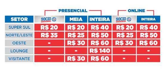A entrada mais barata para a partida custa R$ 20, para o setor Super Sul, enquanto o mais caro vale R$ 140, para o Lounge Premium. Crianças de até onze anos de idade não pagam.
