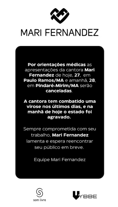 "Por orientações médicas as apresentações da cantora Mari Fernandez de hoje, 27, em Paulo Ramos/MA e amanhã, 28, em Pindaré-Mirim/MA, serão canceladas. A cantora tem combatido uma virose nos últimos dias e na manhã de hoje o estado foi agravado. Sempre comprometida com seu trabalho, Mari Fernandez lamenta e espera reencontrar seu público em breve."