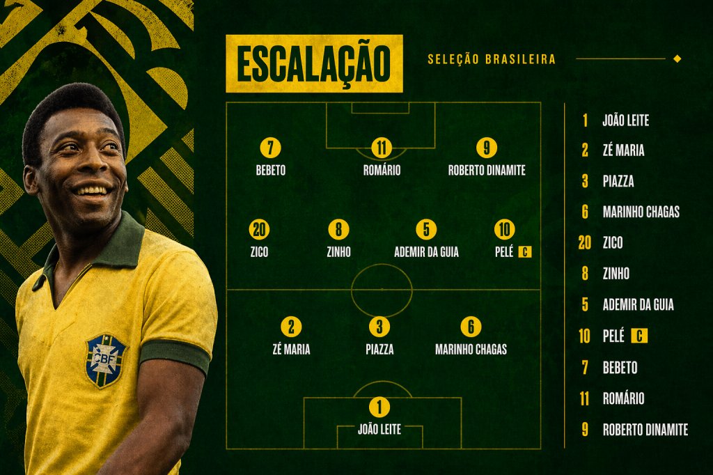 Entre os nomes selecionados, a reportagem montou uma formação no esquema 3-4-3, com alguns improvisos, para escalar os onze titulares. O BN foi a campo com: João Leite; Zé Maria, Piazza e Marinho Chagas; Zico, Zinho, Ademir da Guia e Pelé; Bebeto, Romário e Roberto Dinamite. Veja abaixo: