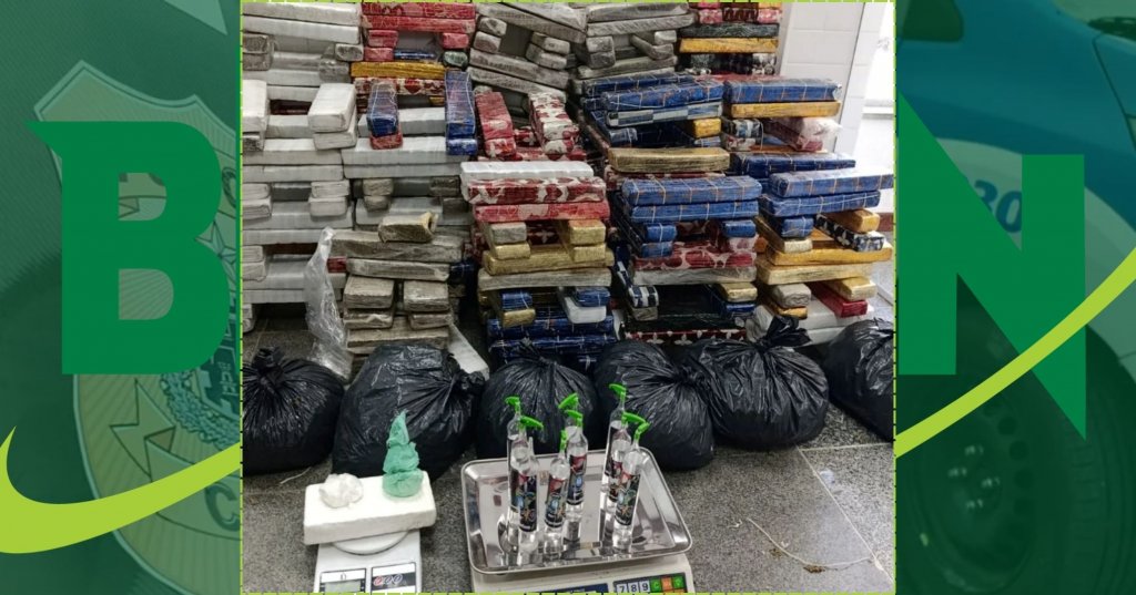 Segundo o major Jorge Freitas, comandante da 65ª CIPM e oficial superior do dia, o material estava distribuído em 479 tabletes prensados de maconha, além de seis sacos grandes da erva in natura. Também foram apreendidos 1 kg de cocaína, nove frascos de lança-perfume e duas balanças de precisão.