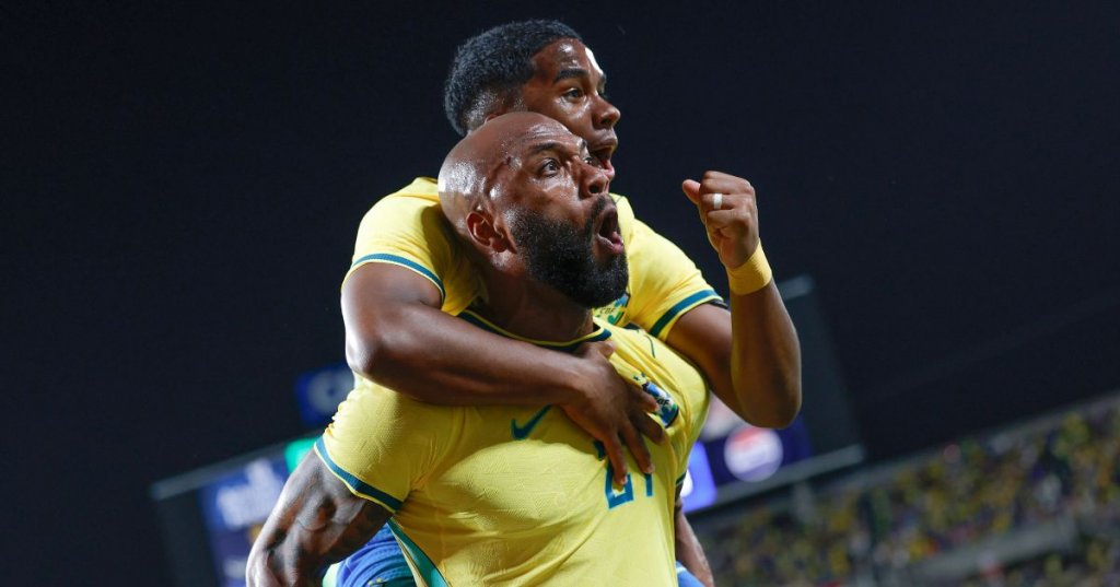 Aos 40 minutos, Endrick tenta dominar a bola na área e é derrubado por Sutalo e ganha pênalti para o Brasil. Igor Thiago vai para a batida, dá uma paradinha rápida e converte. Brasil na frente.