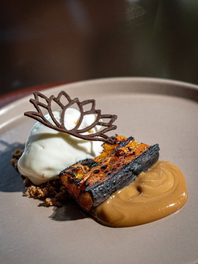 As sobremesas do almoço disponíveis são cremeux de maracujá com ganache de chocolate e crumble de semente de maracujá ou banana em texturas com doce de leite e farofa de canela.
