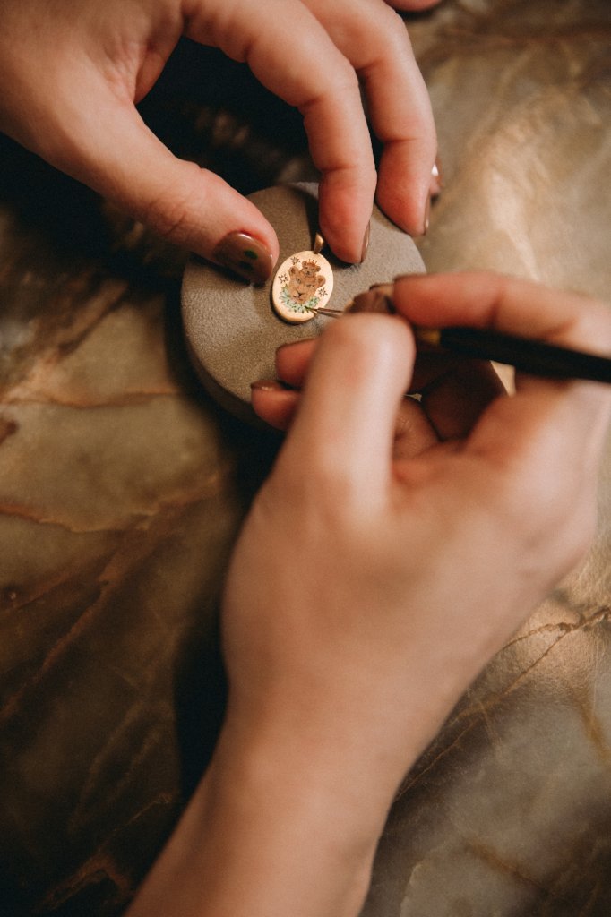 O processo criativo começa sempre pela história, nunca pela pintura. “Antes mesmo do desenho, buscamos entender o simbolismo, a emoção e o propósito que aquela coleção irá carregar. Só depois dessa etapa afetiva nasce a escolha dos elementos, dos desenhos e do design das peças”, afirmou. Segundo Mariana, o processo é lento e minucioso. As peças levam cerca de 30 dias para ficarem prontas e passam por diferentes fases até chegarem ao resultado final. O ouro é modelado, maturado, fundido, lapidado e recebe acabamento manual. Só então começa a etapa mais delicada: a micropintura.