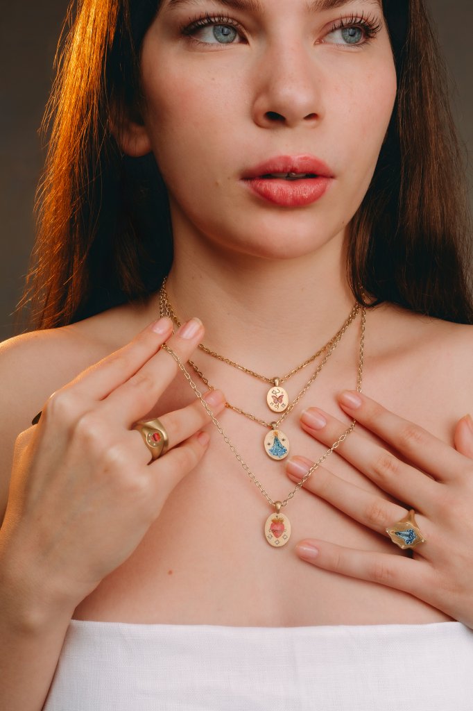 Com brincos, colares, anéis e pingentes, a joalheria busca criar peças que transcendam o tempo, carregando histórias, intenção e a delicadeza de cada gesto. O projeto surge do desejo de resgatar a força simbólica do ouro renascentista e, ao mesmo tempo, construir uma estética própria, guiada pela mão que pinta e pela paciência do artesanato.