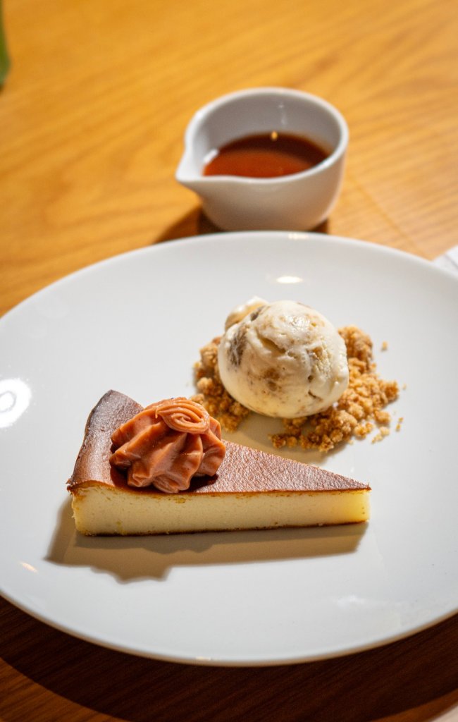As sobremesas incluem tiramisù, profiteroles, pavlova, mousse de chocolate, cheesecake, banoffee, maçã assada com creme inglês e versões de petit gâteau.