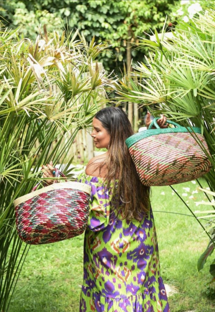 A palha da piaçava, matéria-prima local utilizada por artesãs da região, surge como referência direta no conceito criativo das peças. Essa conexão com o território também se expressa na escolha das cores, com predominância de tons terrosos e elementos naturais aplicados às peças.