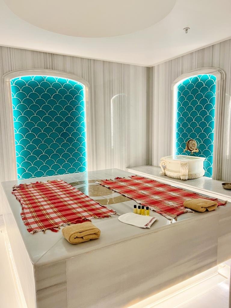 Como falei, existem diferentes tipos de banho turco, mas neste SPA eles oferecem um mesmo processo mas com três tipos diferentes de esfoliação: o Sultan Hammam (foi o que eu escolhi, em que a esfoliação é feita com uma luva especial), o Shahrzad Hammam (eles utilizam pó de café para esfoliar a pele) e o Cleopatra Hammam (no qual usam o sal rosa marinho para uma esfoliação mais profunda). Além disso, optei pela Aroma Relax Massage, mas eles também oferecem outras opções com pedras quentes, shiatsu, com velas, ervas e outras.