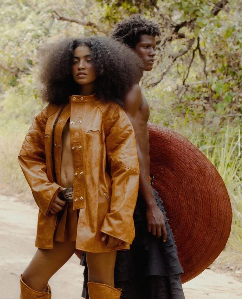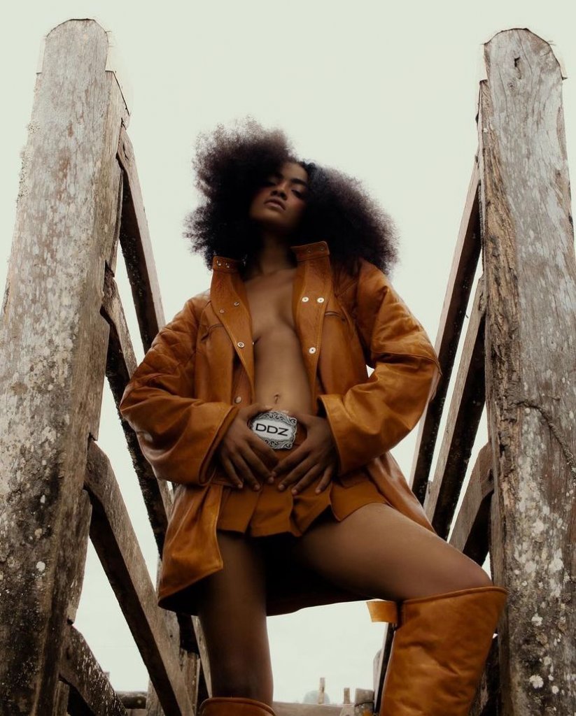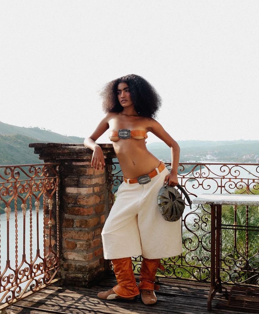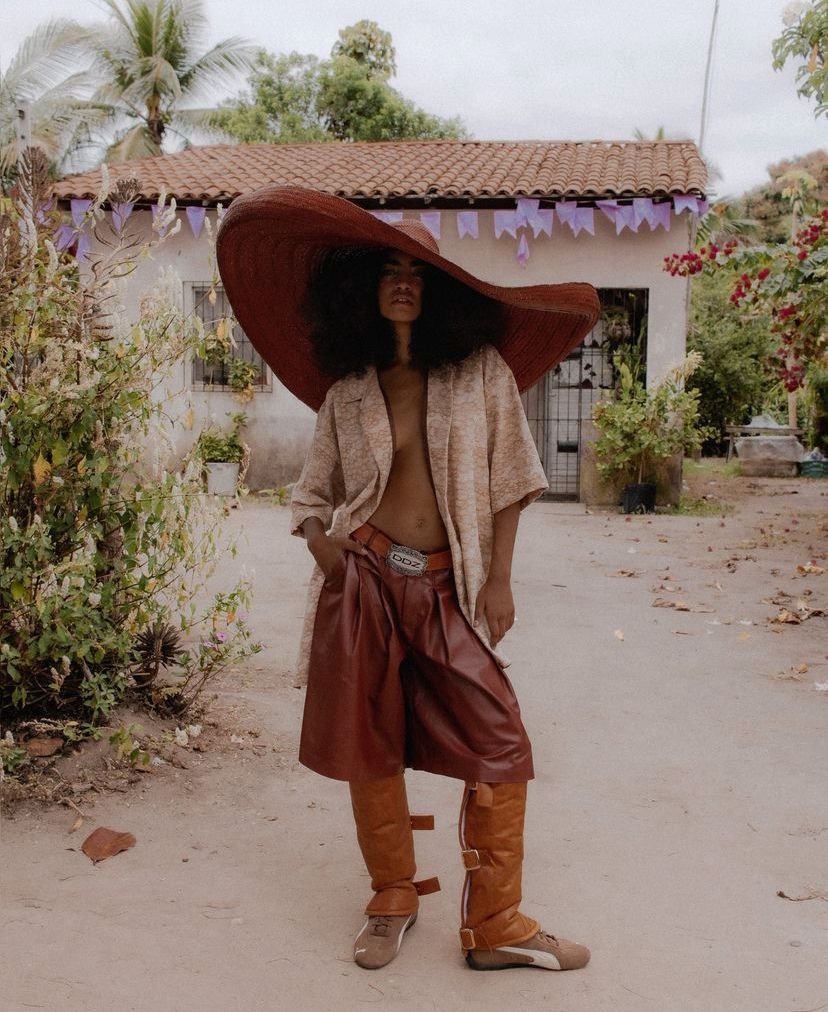 A coleção “Brasiliano” não é só um resgate; é uma reconstrução do sertão e do cangaço com a sensibilidade da moda atual. E, embora a Dendezeiro tenha personalidade própria, é difícil não enxergar ecos da tendência country que voltou com força nos últimos anos, especialmente depois de Beyoncé trazer o tema ao mainstream em sua era Renaissance. O movimento country, com suas botas, chapéus e couro, agora é validado como expressão da cultura negra global, abrindo espaço para uma interpretação mais próxima e genuína do sertão baiano.