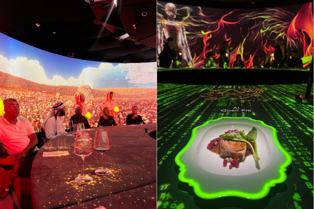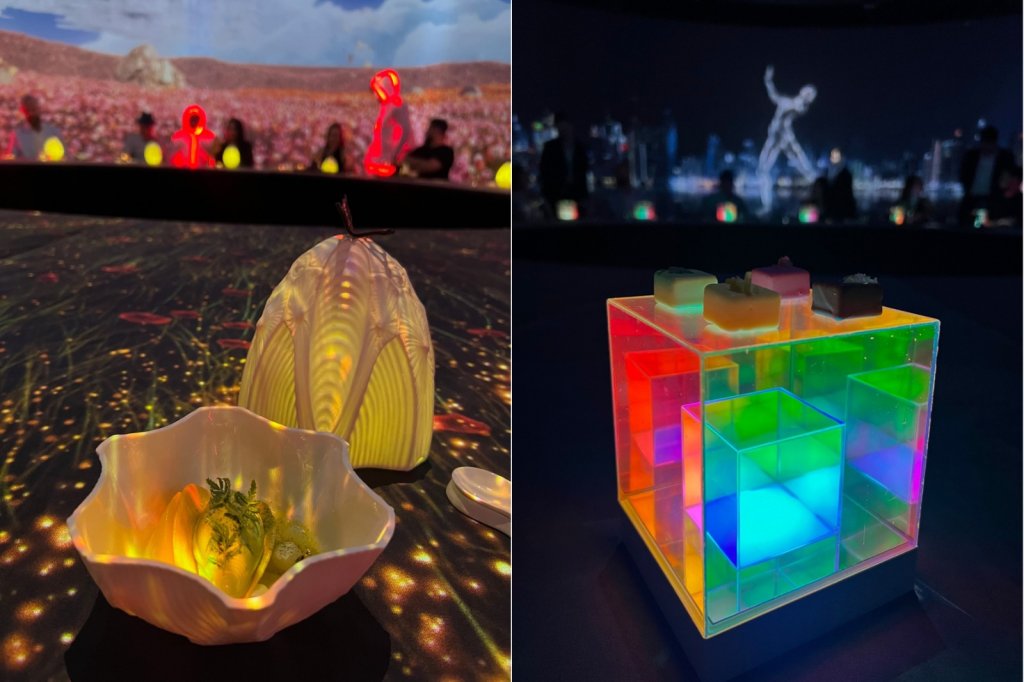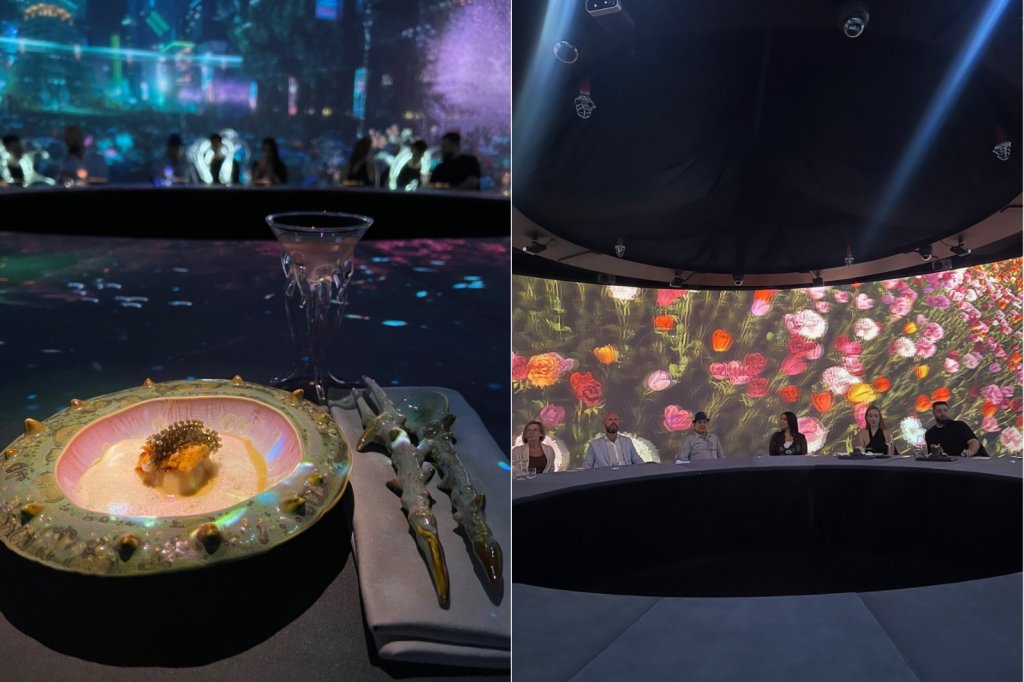 Já o segundo show é o “Imaginary Future: Uma Visão Gastronômica do Amanhã”, que eu acompanhei e que explora cenários potenciais do amanhã. A performance de sete atos e sete pratos mergulha em visões futuristas, desde a dominação por inteligência artificial até a construção de megacidades no fundo do oceano.